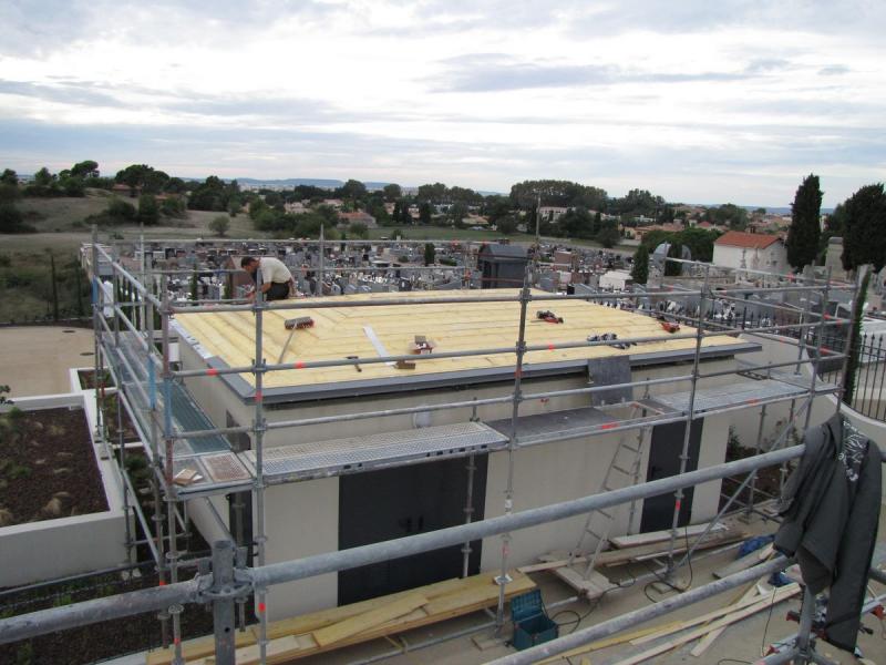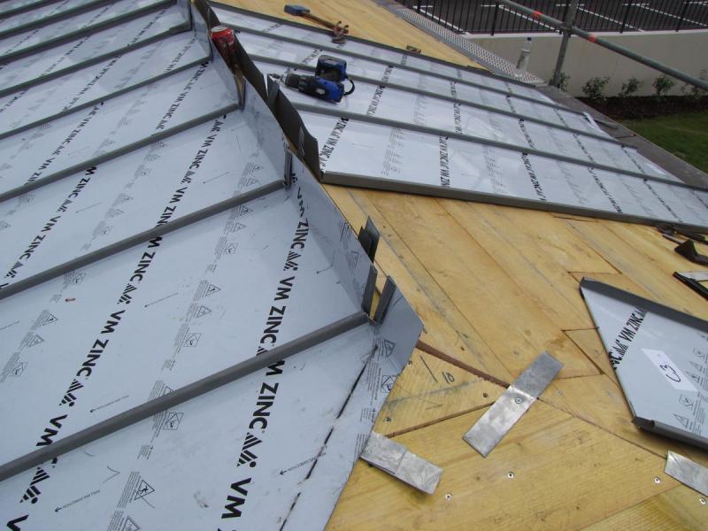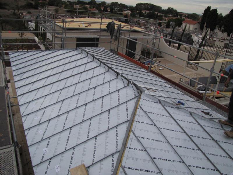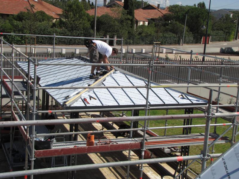 couverture zinc Quartz à joint de bout d'un préau + local technique environ 100 m2 sur la commune de St VICTORET (13)